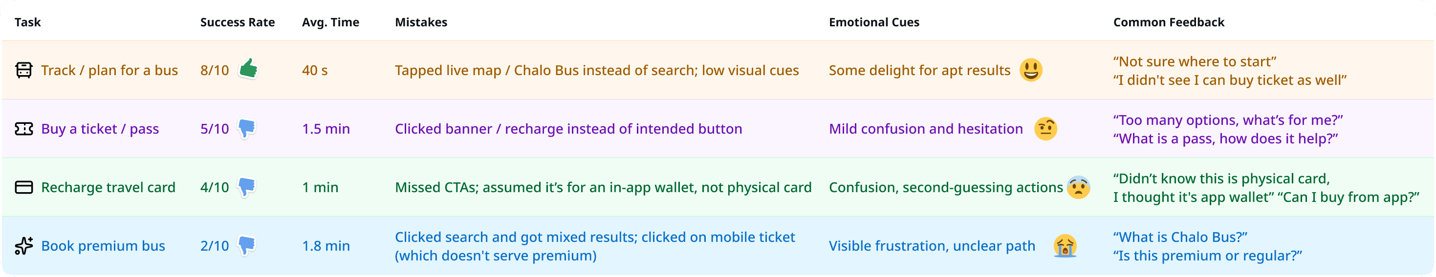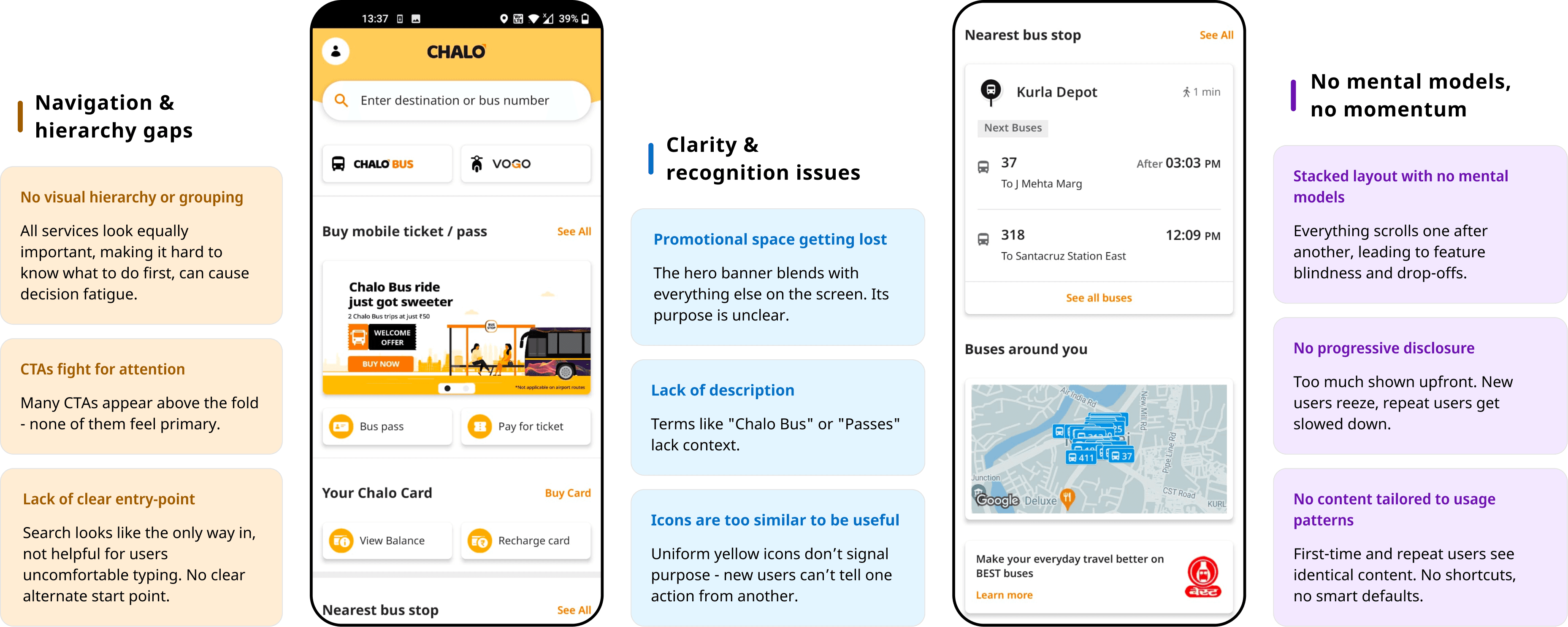 Even basic tasks like ticket purchase caused hesitation in riders. Labels lacked clarity and unfamiliar terms like “Chalo Bus” led to second-guessing.